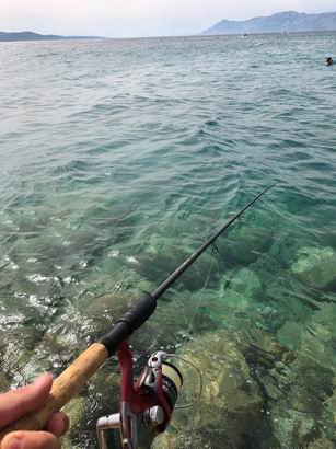 Angelkarten) Wir versuchten als Erstes in der Abenddämmerung gegenüber vom Hafen unser Glück. Das steil abfallenden Ufer sowie die Strömung sah wirklich vielversprechend aus. Leider waren Shrimps sowie Sardellen keine gute Wahl. Die kleinen Brassen sowie Krebse waren hungrig, schnell, und gründlich. Wir hatten ein besseren Biss, der nach einem kurzen Drill leider abging. Mit der Dunkelheit kam dann allerdings eine unschöne Überraschung welche uns zu einem Platzwechsel zwang. Ein beleuchtetes U-Boot fuhr direkt an unserer zuvor auserkorene Angelstelle hin und her. Wir liefen also wieder Richtung Ferienwohnung am Ufer zurück. Dort sahen wir mit Kopflampen, einheimische Angler sitzen.Also neuer Versuch an einem anderen Tag mit neuen Ködern.Wir holten uns Tintenfischstreifen, doch leider brachte auch das nicht den gewünschten Erfolg. Unser Sortiment an Spinnern, Wobblern und Gummifischen sollte ebenfalls nichts bringen. Also letzter Versuch um nicht ganz als Schneider Heim zu fahren. Während Mutti mit Kind baden war konnte ich mit der leichten Matchrute mehrere 5-7cm große Brassen überlisten.